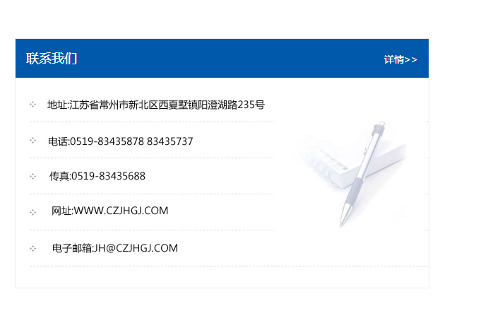 地址:常州市新北區(qū)友邦商務(wù)大廈1幢16、17層  電話:0519-85101652  傳真:0519-85112595  郵編:213022  網(wǎng)址:www.cz-jiayue_cn.zsyakq.com  郵箱:xiajifengaa@163.com